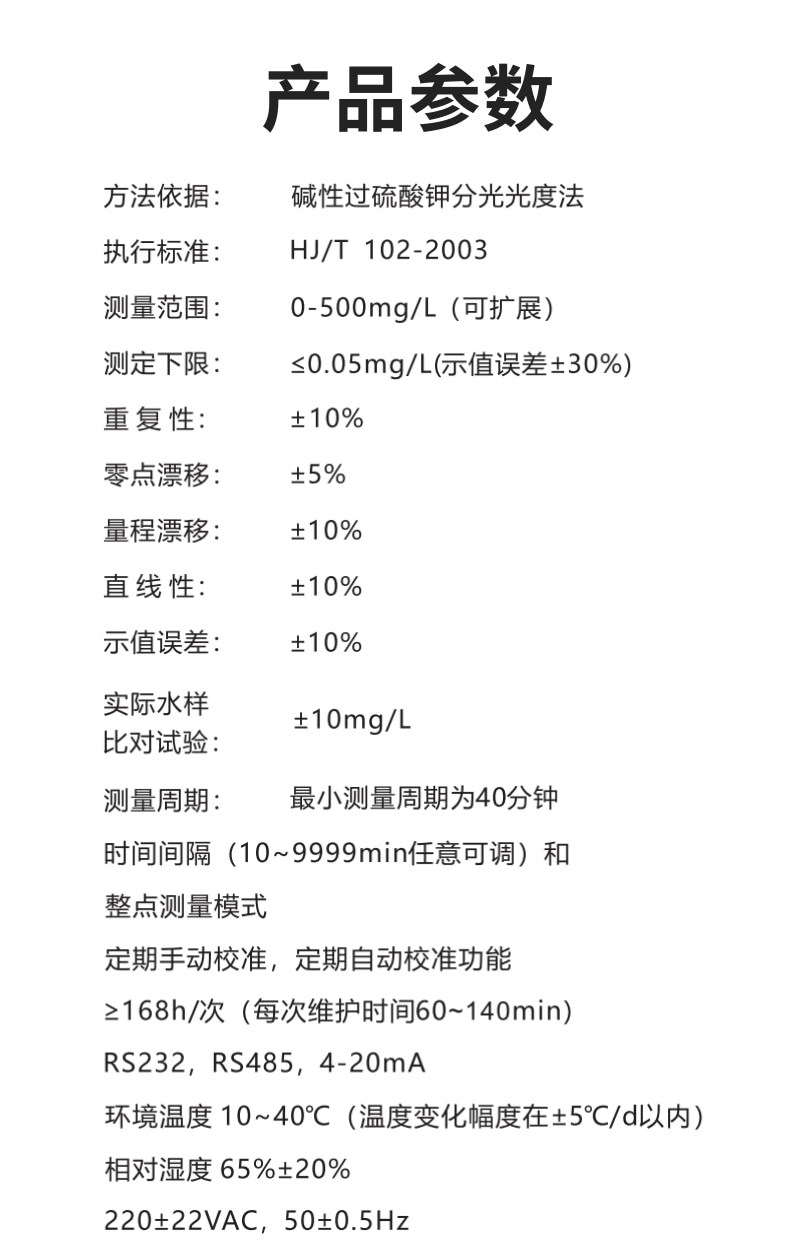 產(chǎn)品簡(jiǎn)介: ·型號(hào):CN1004A(柜式)、CN1004B (精巧型) √ 采用分光光度法,測(cè)量更精準(zhǔn); √ 10寸智能觸控大屏,人機(jī)界面友好; √ 自動(dòng)標(biāo)準(zhǔn)樣品核查,減免人工作業(yè); √ 自動(dòng)連續(xù)監(jiān)測(cè),實(shí)時(shí)數(shù)據(jù)遠(yuǎn)傳; √ 異常報(bào)警和斷電不會(huì)丟失數(shù)據(jù); √ 超大數(shù)據(jù)存儲(chǔ),保存歷史5年以上。