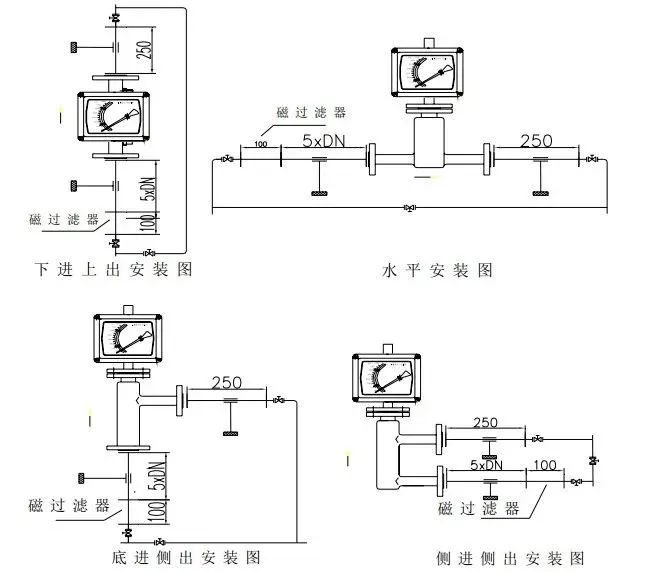 應(yīng)在儀表上游裝過(guò)濾器。帶有磁性耦合的金屬管轉(zhuǎn)子流量計(jì)用于可能含磁鐵性雜質(zhì)流體時(shí),應(yīng)在儀表前裝磁過(guò)濾器。要保持浮子和錐管的清潔,特別是小口徑儀表,浮子潔凈程度明顯影響測(cè)量值。